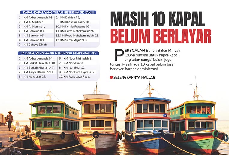 Persoalan Bahan Bakar Minyak (BBM) subsidi untuk kapal-kapal angkutan sungai belum juga tuntas. Masih ada 10 kapal belum bisa berlayar, karena administrasi.