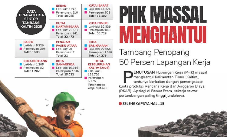 Pemutusan Hubungan Kerja (PHK) massal menghantui Kalimantan Timur (Kaltim), tentunya berkaitan dengan pemangkasan kuota produksi Rencana Kerja dan Anggaran Biaya (RKAB). Apalagi di Benua Etam, pekerja sektor pertambangan paling tinggi jumlahnya.